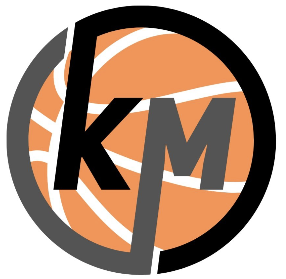 Logo with stylized orange volleyball background and black letters 'KM' and black and gray circle outline.